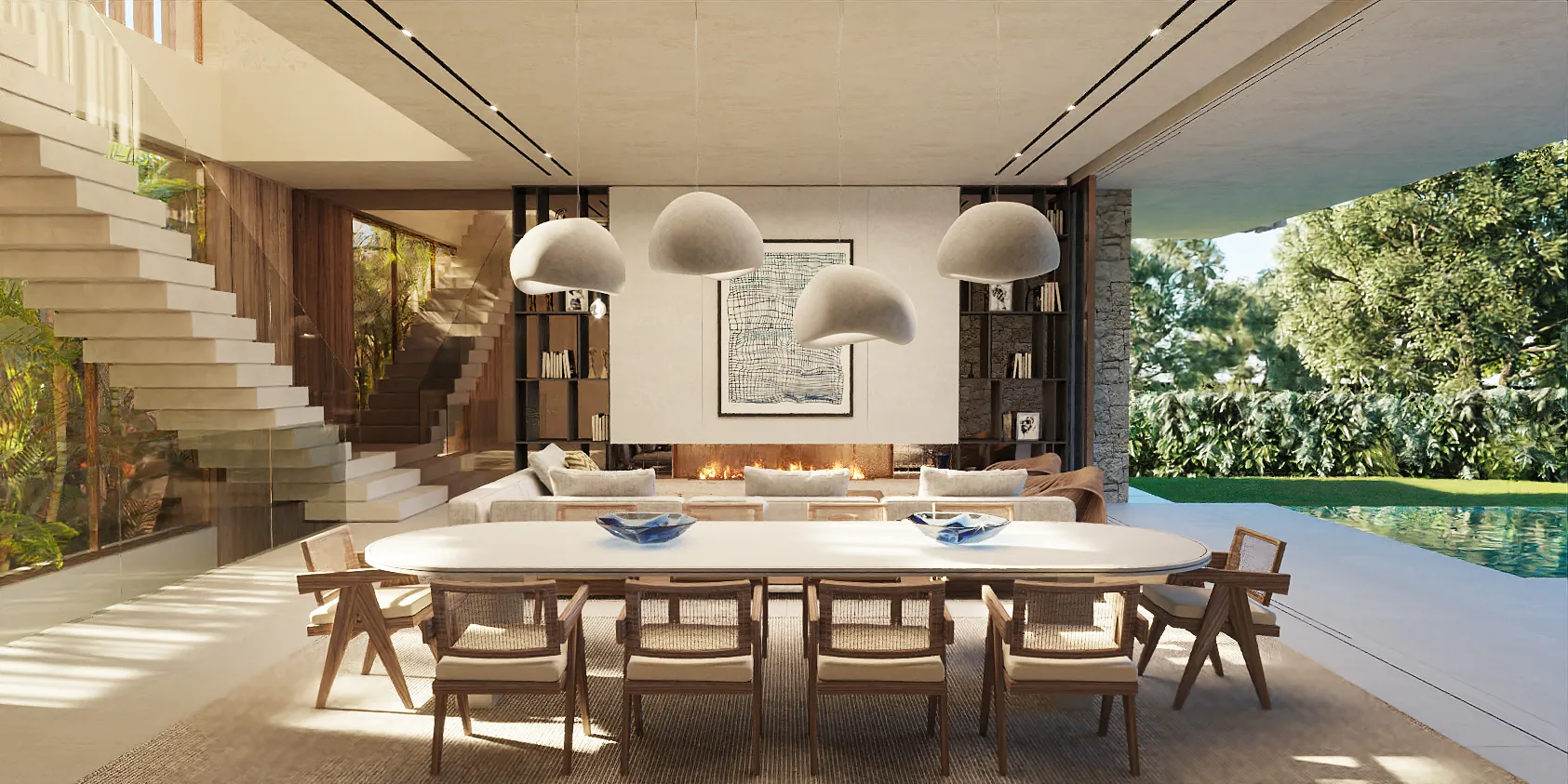 Through clean lines and a strategic layout, the design amplifies natural light and optimises every square metre. The high ceilings and open plan living space extend outward to the pooland garden, creating a feeling of expansiveness and balance.
