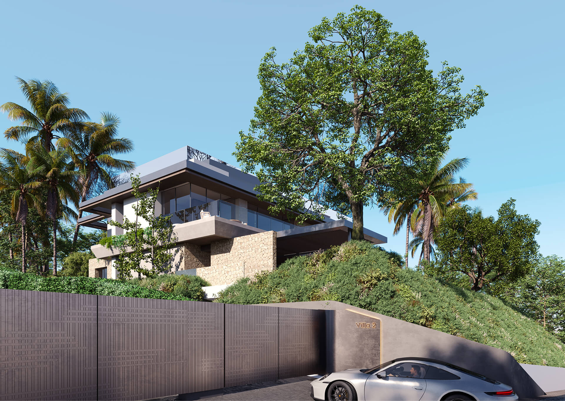 The main challenge was to combine privacy, expansive views and functionality on a sloped plot with mature vegetation. It was essential to create a striking entrance while ensuring smooth circulation between social, private and work areas, including wellness and leisure spaces. The villa also needed to blend harmoniously with the surroundings, minimizing its visual presence from the exterior.